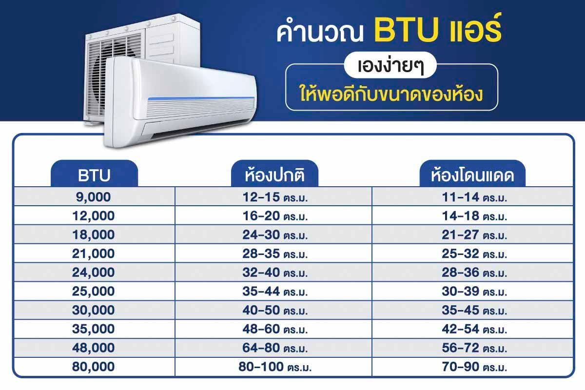 BTU (British Thermal Unit) คือหน่วยวัดความสามารถในการทำความเย็นของแอร์ การเลือก BTU ให้เหมาะสมกับขนาดห้องเป็นเรื่องสำคัญ หากต่ำเกินไป เครื่องจะทำงานหนักเกินความจำเป็น กินไฟ และเย็นไม่ทั่วถึง หากสูงเกินไปก็สิ้นเปลืองโดยไม่จำเป็น